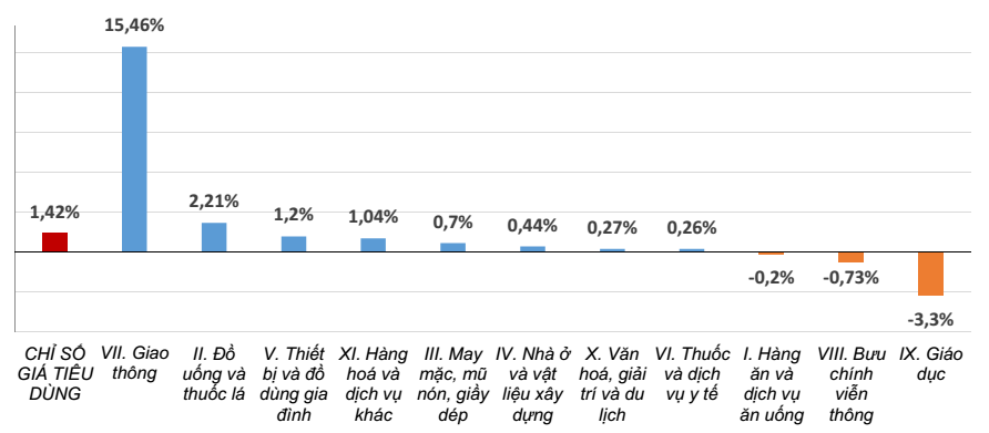 Biểu đồ tốc độ tăng/giảm CPI tháng 2/2022 so với cùng kỳ năm 2021. (Nguồn: Tổng cục Thống kê)