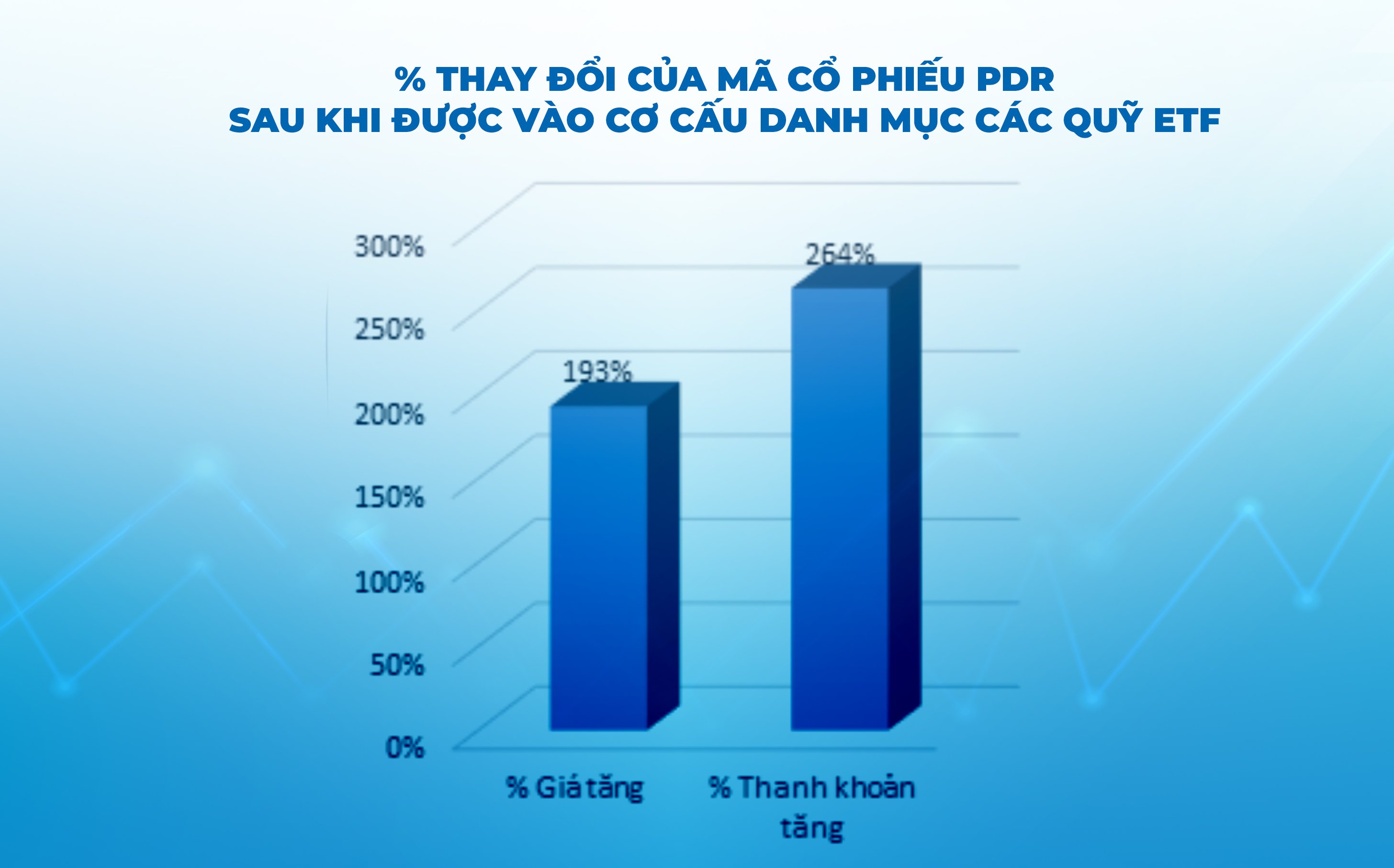 Một trong những đại diện tiêu biểu gần đây nhất trong việc lột xác nhờ ETF không nói đâu xa chính là Công ty Cổ phần phát triển Bất Động Sản Phát Đạt (PDR) một mã ngành bất động sản. Khởi động mới chỉ từ tháng 02/2021, khi PDR thoả mãn được các tiêu chí của các rổ chỉ số, ồ ạt các quỹ ETF bắt đầu mua vào từ Quỹ Fubon FTSE ETF, FTSE Vietnam Index đến cả VNM ETF của quỹ Vaneck đã đẩy giá trị vốn hóa của PDR lên 41,716.35 tỷ đồng, tương đương 1,85 tỷ USD, tăng hơn 700 triệu USD so với hồi tháng 2/2021.