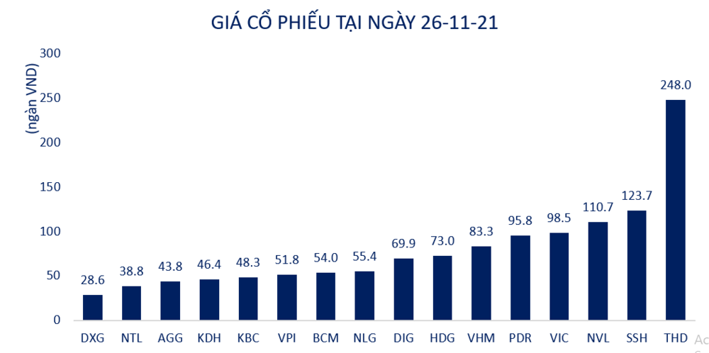Năm 2021 chứng kiến sự tăng trưởng mạnh mẽ của nhóm cổ phiếu Bất động sản. Đơn cử như cổ phiếu DIG đã tăng từ 18.900/cổ phiếu từ ngày tháng 2/2020 lên mức 69.900đ/cổ phiếu tại ngày 26/11/2021, tương ứng với mức tăng 370%; cổ phiếu NLG cũng đã tăng từ vùng giá 29,750đ từ đầu năm 2021 lên mức 55,000đ/cổ phiếu tại ngày 24/11; hay như cổ phiếu PDR cũng đã tăng từ mức 32.200đ/cổ phiếu lên 94.000đ/cổ phiếu trong từ ngày 4/1/2021 tới ngày 26/11/2021.