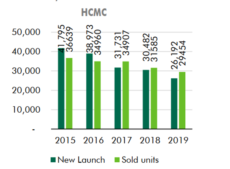 Nguồn cung và lượng tiêu thụ căn hộ tại TP.HCM đã thấp nhất 5 năm (2015 - 2019). (Nguồn: CBRE)