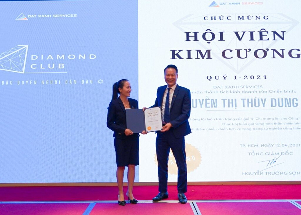 Cũng trong Quý 1/2021, DXS đã xướng danh thành viên đầu tiên của Câu lạc bộ Diamond. Với doanh số giao dịch là hơn 43 tỷ đồng và phí dịch vụ mang về hơn 1,5 tỷ đồng, “chiến binh” Nguyễn Thị Thùy Dung đã vượt xa chỉ tiêu đánh giá để vinh dự nhận được huy hiệu bậc Diamond cùng “combo” đặc quyền khủng bằng hiện kim và hiện vật gồm: 1 lượng vàng SJC, gói tài trợ ngân sách chăm sóc khách hàng VIP, gói tài trợ ngân sách Marketing trực tiếp, chuyến du lịch đẳng cấp 6 sao dành cho gia đình. Đặc biệt, thành viên CLB Diamond còn được DXS gửi tặng quà tri ân, cảm ơn đến gia đình, người thân và vinh danh trên bức tường danh vọng của công ty.