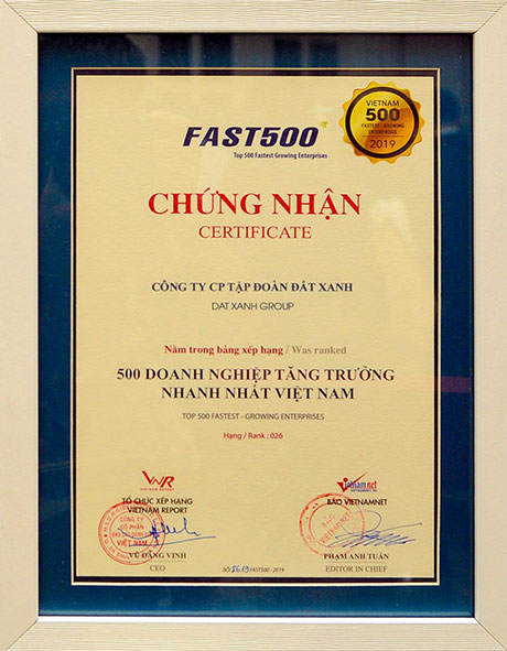 Theo đánh giá, Tập đoàn Đất Xanh đã xuất sắc vượt qua hơn 474 doanh nghiệp để vươn lên vị trí 26 trong Top 500 doanh nghiệp tăng trưởng nhanh nhất Việt Nam năm 2018 và bất ngờ giành vị trí thứ 4 trong top 50 doanh nghiệp tăng trưởng xuất sắc nhất Việt Nam cùng với các doanh nghiệp khác như Vietjet, Tập đoàn Trường Hải, FLC…