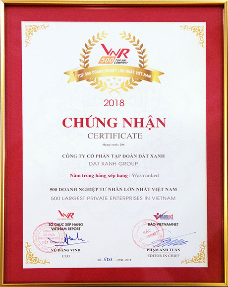 Tối ngày 16/01/2019 tại TP.HCM, tổ chức Báo cáo Đánh giá Việt Nam VNR (Vietnam Report) đã phối hợp với báo Vietnamnet tổ chức Lễ công bố Bảng xếp hạng VNR500 “Top 500 doanh nghiệp lớn nhất Việt Nam năm 2018”. Trong lĩnh vực bất động sản, Tập đoàn Đất Xanh góp mặt ở vị trí thứ 9 trong Top 10 doanh nghiệp tư nhân lớn nhất Việt Nam năm 2018.