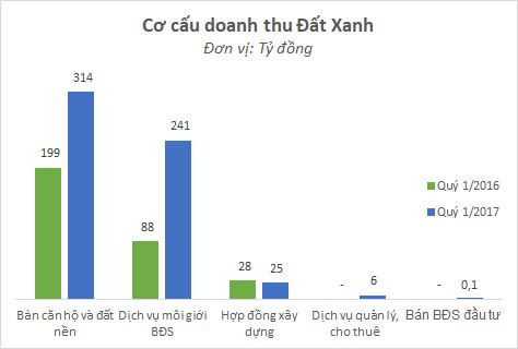 Trong cơ cấu doanh thu của Đất Xanh năm nay, dịch vụ môi giới bất động sản đóng góp tỷ lệ quan trọng với doanh thu 241 tỷ đồng, gấp gần 3 lần năm trước. Đồng thời, doanh thu từ bán căn hộ và đất nền cũng tăng trưởng tốt.