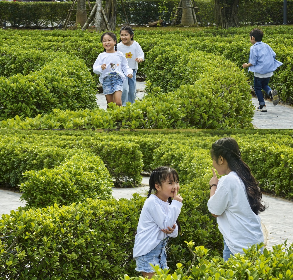 Vườn mê cung với đường kính 30m và 7 vòng tường cây xanh mát cao 65cm, là nơi bố mẹ có thể nhìn thấy nụ cười cùng sự lém lỉnh, đáng yêu của con trẻ.