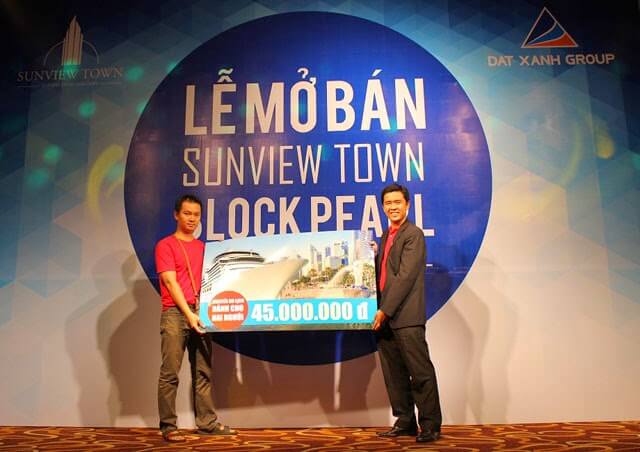 Chương trình khuyến mại “Mua nhà Sing – Du thuyền Sing” do Tập đoàn Đất Xanh tổ chức đã xác định được các chủ nhân. Đó là anh Nguyễn Lê Văn (Q.Tân Phú, TPHCM) – đã trở thành người may mắn nhất khi trúng thưởng 1 cặp vé du thuyền 5 sao dành cho 2 người và chị Vũ Thị Hiền (Thủ Đức, TPHCM) trúng thưởng iPhone 6. Đây là 2 khách hàng may mắn nhất khi mua căn hộ Block Pearl – dự án Sunview Town trong đợt mở bán ngày 14/12/2014 vừa qua.