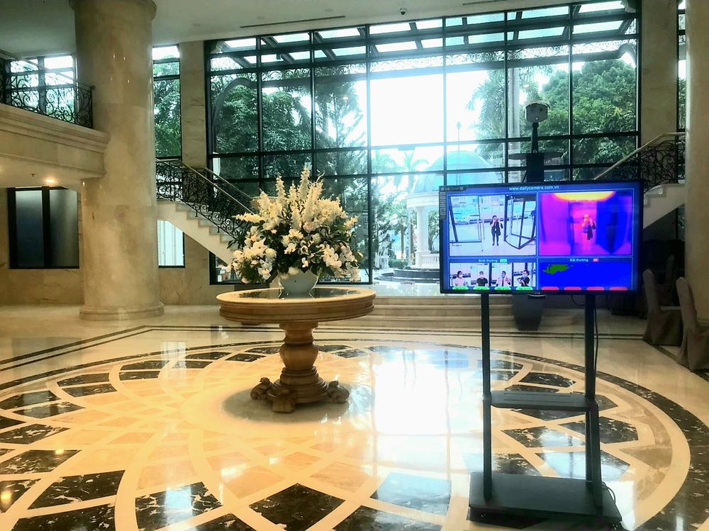 Hình ảnh thiết bị camera đo thân nhiệt tự động tại sảnh chính tòa nhà.