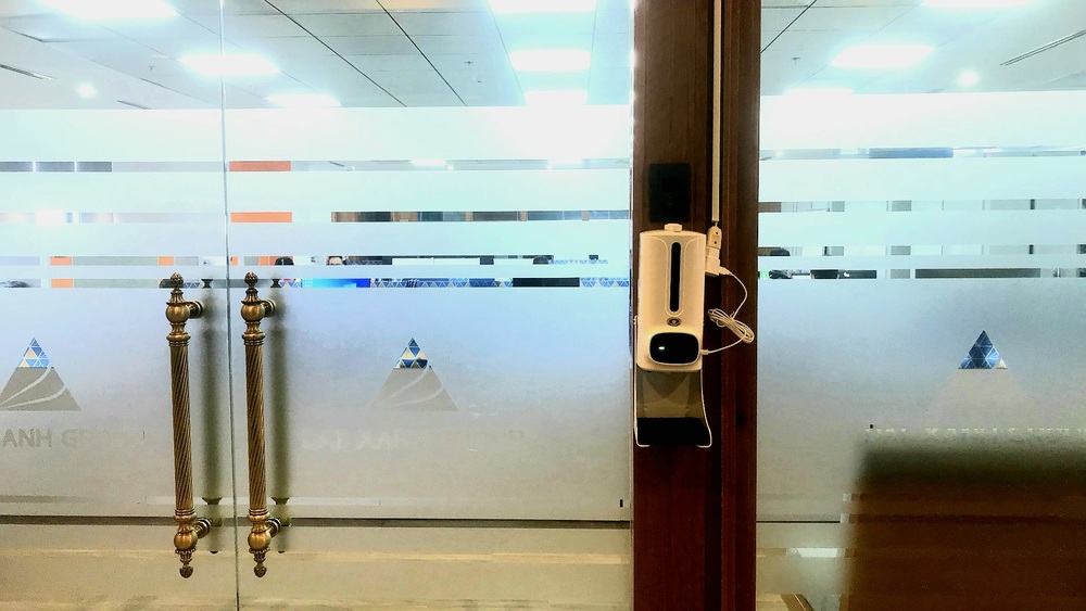 Ngay bên ngoài cửa ra vào mỗi tầng đều lắp đặt thêm máy rửa tay tự động để CBNV thực hiện khử khuẩn.