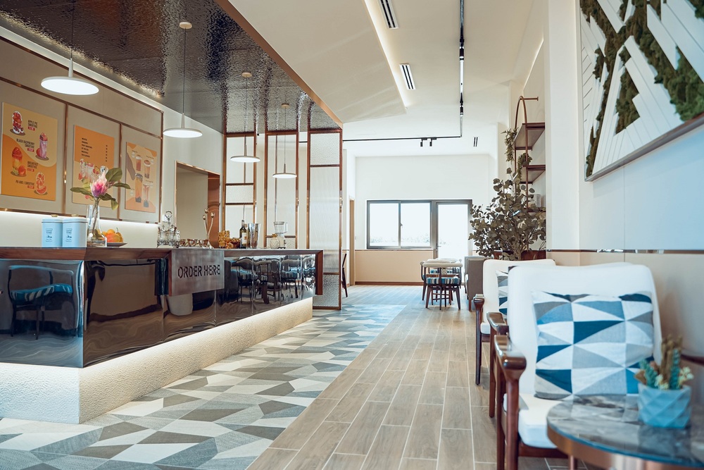 Mặt tiền rộng 6m, phối hợp với hệ thống cửa kính lớn đã mang đến tầm nhìn phóng khoáng, thông suốt, tận dụng tối đa ánh sáng cho tầng 1. Lối thiết kế mở còn tạo sự nổi bật cho các sản phẩm bên trong cũng như mang đến không gian mua sắm sang trọng bên trong cửa hàng. Đặc biệt, với định hướng kinh doanh F&B, gia chủ không thể bỏ qua khoảng sân sau 3,5m – nơi có thể bố trí thành khu vực thưởng thức ẩm thực ngoài trời khơi gợi nhiều cảm hứng.