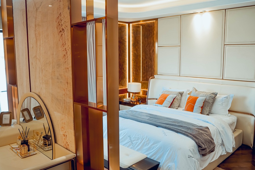 Được thiết kế theo phong cách hiện đại kết hợp sự tỉ mỉ, chỉn chu, phòng ngủ master mang đến cho khách tham quan trải nghiệm hoàn mỹ từ đường nét đến từng chi tiết.