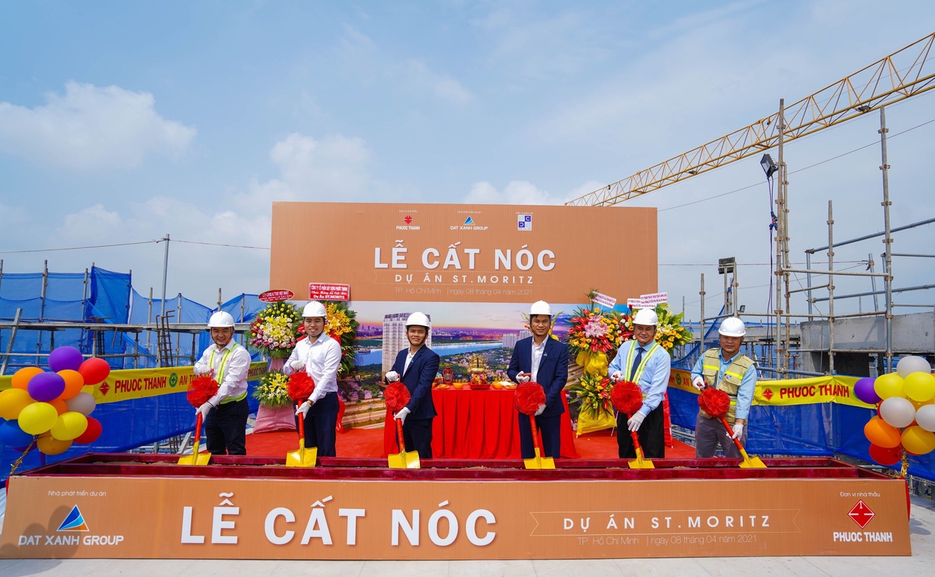 Lễ cất nóc cao ốc căn hộ và văn phòng St.Moritz đã chính thức diễn ra vào sáng ngày 8/4 với sự tham dự của đại diện lãnh đạo từ Chủ đầu tư (Tập đoàn Đất Xanh), tổng thầu xây dựng (Cty CP Xây dựng Phước Thành) và ICIC - đơn vị tư vấn giám sát.