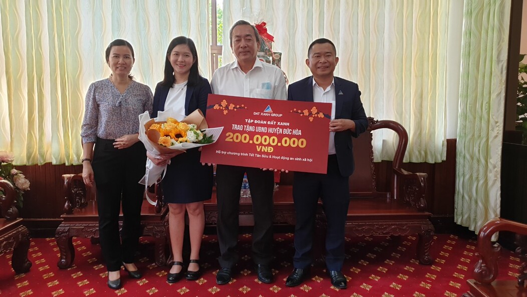 Buổi lễ trao quà Tết Tân Sửu 2021 được tổ chức tại trụ sở UBND huyện Đức Hòa, tỉnh Long An, với sự tham gia của lãnh đạo Tập đoàn Đất Xanh, các mạnh thường quân và lãnh đạo địa phương đại diện các gia đình chính sách có hoàn cảnh khó khăn, kém may mắn trên địa bàn huyện Đức Hòa, tỉnh Long An. Tham gia lễ trao quà Tết lần này, Tập đoàn Đất Xanh trao tặng 200 triệu đồng cho chính quyền để chuyển cho người dân nơi đây. Do ảnh hưởng của dịch bệnh hiện đang diễn biến phức tạp, buổi lễ được tổ chức đơn giản, tuân thủ khuyến cáo hạn chế đông người của Bộ Y tế.
