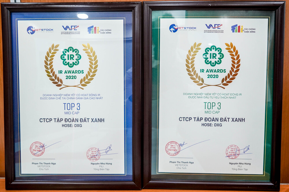 Ngày 22/09, tại TP.HCM, Công ty Cổ phần Tập đoàn Đất Xanh (HoSE: DXG) đã xuất sắc được vinh danh ở hai hạng mục quan trọng gồm Top 3 Doanh nghiệp niêm yết (Mid Cap) có hoạt động IR được nhà đầu tư yêu thích nhất và Top 3 Doanh nghiệp niêm yết (Mid Cap) có hoạt động IR được định chế tài chính đánh giá cao nhất trong lễ trao giải IR Awards 2020. Đây là năm thứ 3 liên tiếp DXG được đề tên ở giải thưởng này.