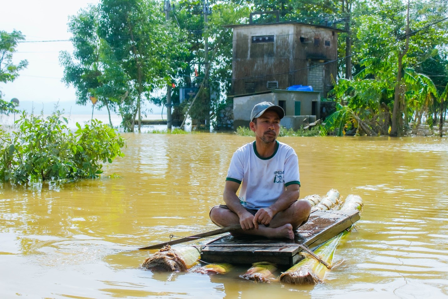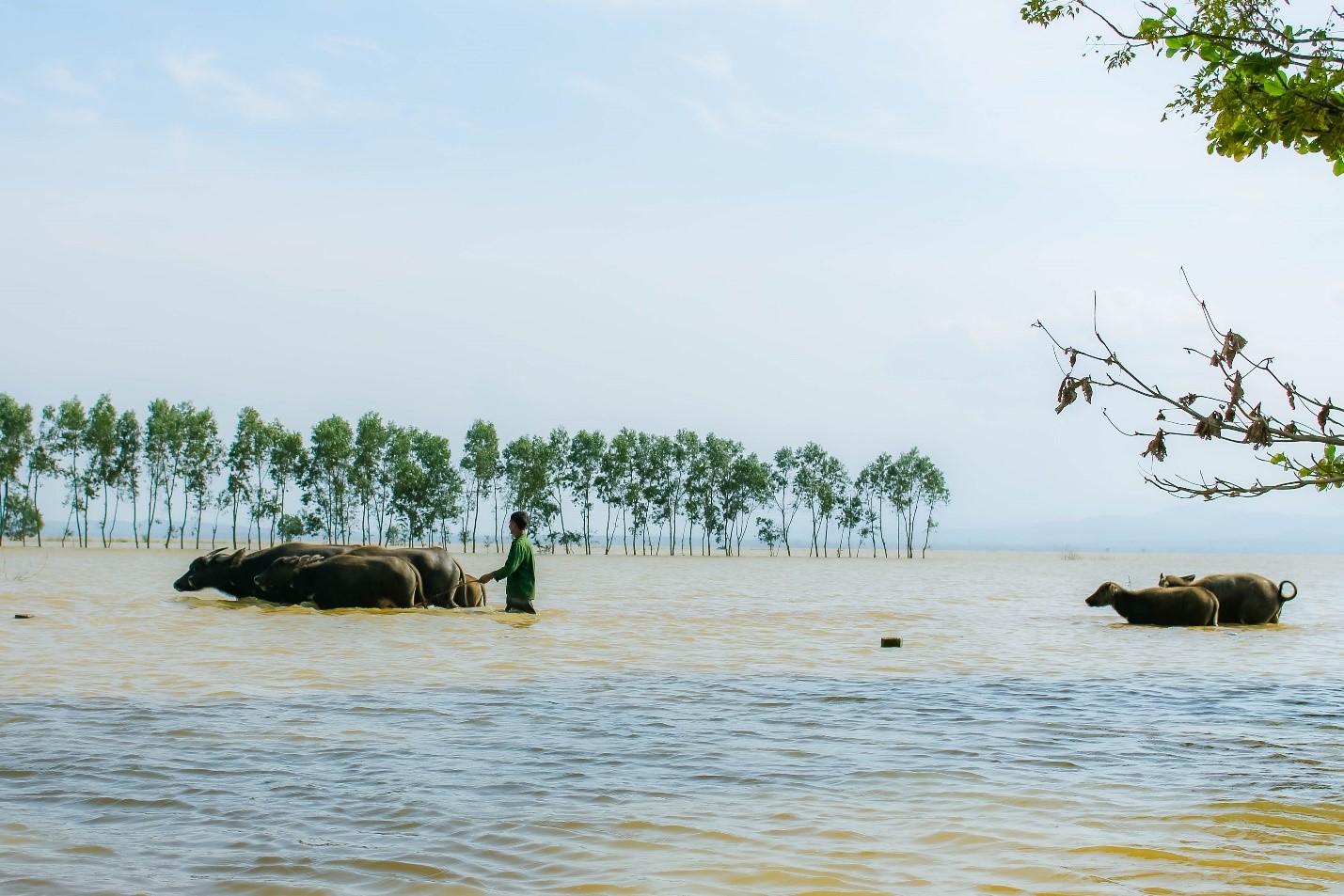 Đoàn nhanh chóng lên xuồng và di chuyển vào các thôn thuộc xã An Thủy, hiện ra trước mắt là biển nước mênh mông; đoàn chia thành nhiều nhóm và bước lên những chiếc xuồng nhỏ, sóng đánh nước văng tung té, từng đợt sóng dồn dập. Nổi trên mặt nước là xác động vật trôi lềnh bềnh, một màu nước lũ đục ngàu với những dòng nước chảy xiết.