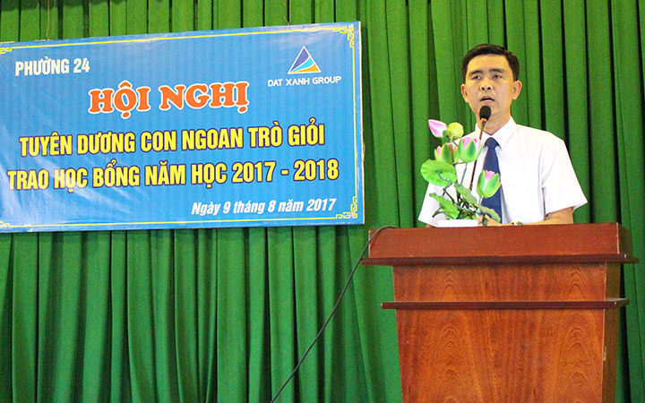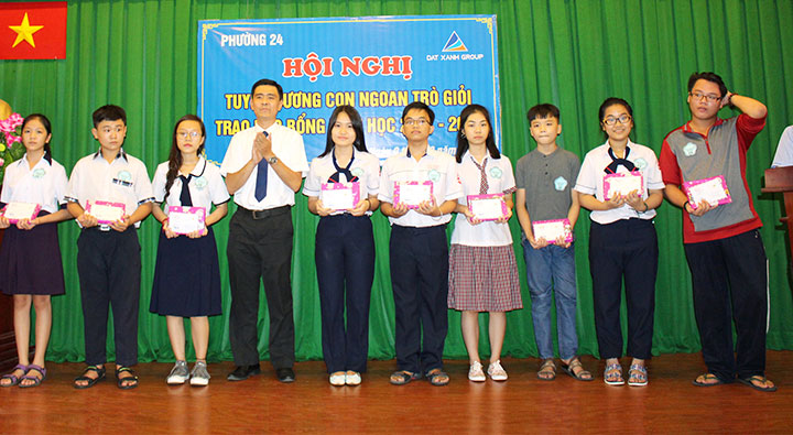 Để góp phần chuẩn bị cho các em học sinh nghèo hiếu học có thêm động lực đến trường, ngày 09/08/2017, Tập đoàn Đất Xanh đã phối hợp cùng UBND Phường 24, Q. Bình Thạnh trao tặng các phần quà tặng (tập vở, bút viết) và các phần học bổng với tổng giá trị tương đương 10.000.000đ cho các bé khoẻ - bé ngoan và các học sinh nghèo hiếu học trên địa bàn phường.