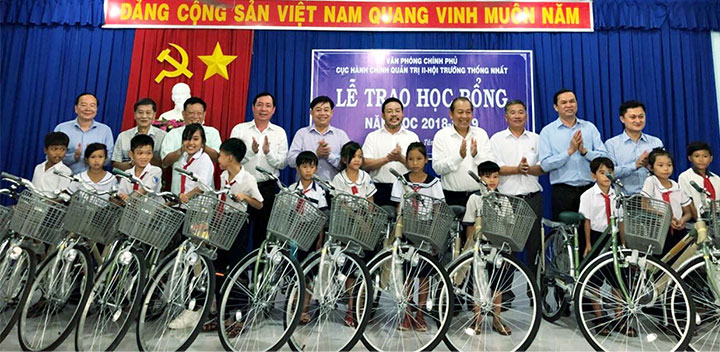 Phó Thủ tướng Trương Hòa Bình và Ông Lương Trí Thìn - Chủ tịch HĐQT kiêm Tổng Giám đốc Tập đoàn Đất Xanh trao học bổng cho đại diện lãnh đạo xã Tân Lập, huyện Tân Biên, Tây Ninh.