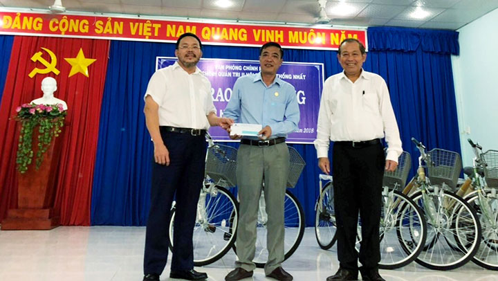 Ông Lương Trí Thìn, Chủ tịch HĐQT kiêm Tổng Giám đốc Tập đoàn Đất Xanh trao xe đạp cho các em học sinh nghèo hiếu học.