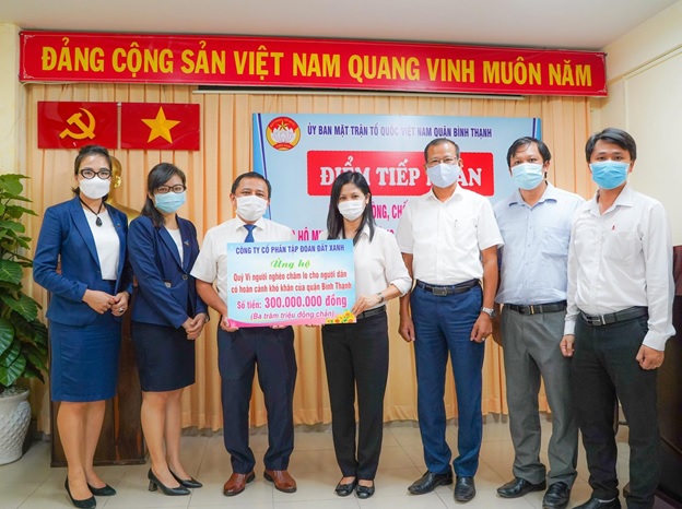 Từ ngày đầu thành lập đến nay, Tập đoàn Đất Xanh đã luôn đề cao phương châm hoạt động “Gắn kết và chia sẻ cộng đồng, xã hội”. Với ước mong được sẻ chia và duy trì cuộc sống ấm no cho cộng đồng, vào ngày 28/6/2021, Tập đoàn Đất Xanh đã quyết định trao tặng 300 triệu đồng đến Ủy ban Mặt trận Tổ quốc quận Bình Thạnh, Thành phố Hồ Chí Minh. Nguồn kinh phí này sẽ được sử dụng để chăm lo cho những người dân đang gặp hoàn cảnh khó khăn do ảnh hưởng của dịch Covid-19.
