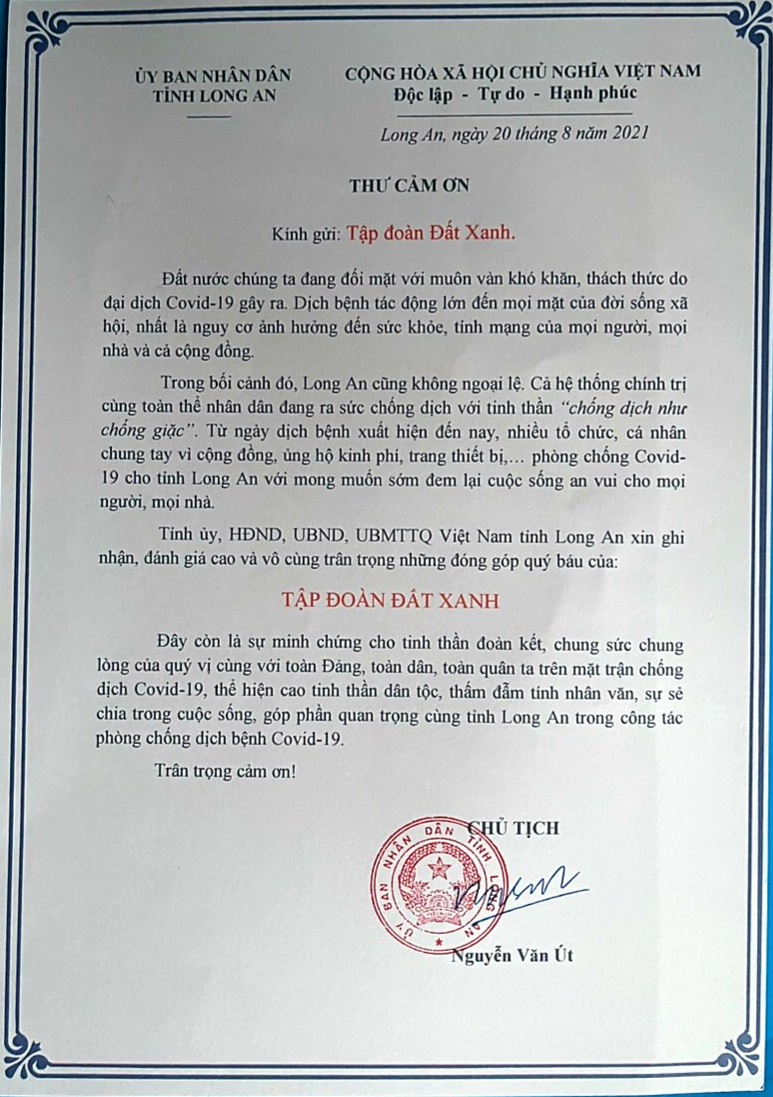 Tại sự kiện trao nhận, ông Nguyễn Anh Việt, Chánh văn phòng UBND tỉnh Long An phát biểu: “Thay mặt Lãnh đạo tỉnh và nhân dân Long An, xin cảm ơn sự hỗ trợ của Tập đoàn Đất Xanh. Chính quyền rất trân trọng sự hỗ trợ kịp thời của Tập đoàn bởi số lượng máy trợ thở này đóng vai trò quan trọng trong công tác điều trị cho các bệnh nhân trên địa bàn tỉnh. Hy vọng trong tương lai, Tập đoàn Đất Xanh sẽ đầu tư và phát triển nhiều dự án, góp phần phát triển đời sống mới tại tỉnh nhà.”