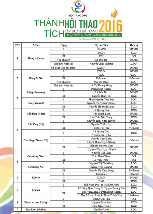 Kết quả Hội thao Đất Xanh 2016 như sau: